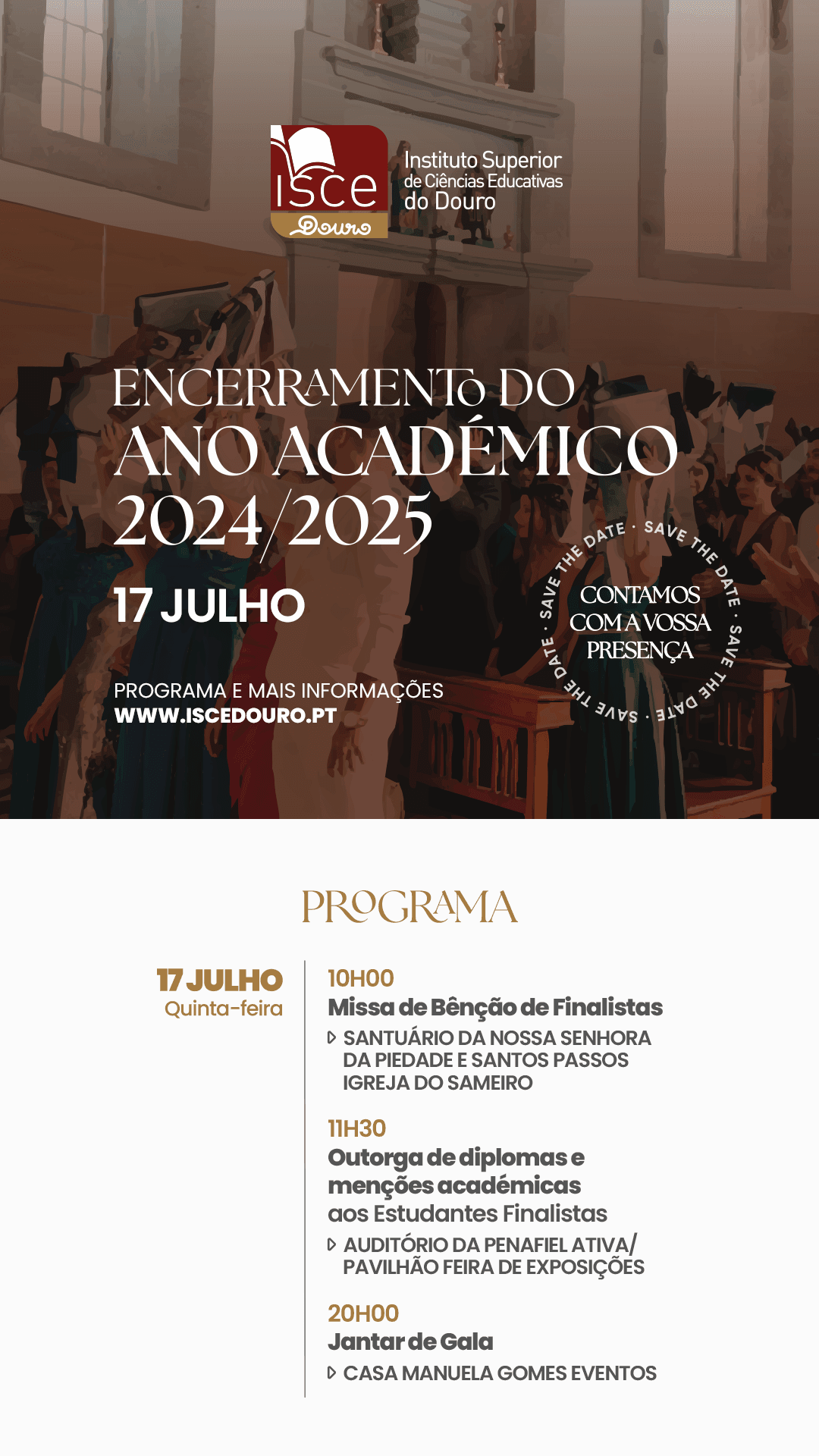 O dia ficará marcado por várias atividades, destacando-se a Missa de Bênção de Finalistas do ISCE Douro – Instituto Superior de Ciências Educativas do Douro, que se realiza no Santuário da Nossa Senhora da Piedade e Santos Passos – Igreja do Sameiro, seguindo-se um momento de Outorga de Diplomas e Menções Académicas aos estudantes Finalistas do nosso Instituto, que terá lugar no Auditório do Pavilhão de Feiras e Exposições de Penafiel (AGRIVAL). No final do dia, realiza-se o Jantar de Gala, organizado pela Associação de Estudantes do ISCE Douro, na Casa Manuela Gomes Eventos.